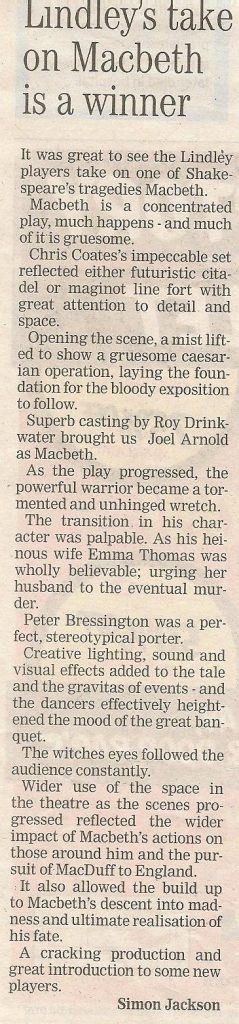 13 Jun Latest News Enjoy: Review December 1, 2021 By Lucie Nash Facebook Twitter Pinterest linkedin Telegram SCREW your courage to the sticking point and head for the Playhouse theatre this week for the Lindley Players' production of Macbe...Continue reading